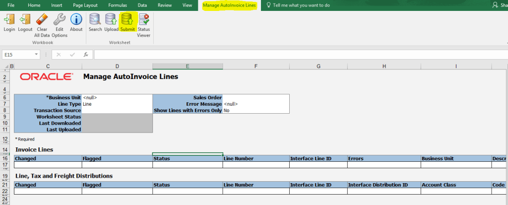 Search Button will bring all the records from AR interface to the present Excel Sheet according to your Search Criteria.